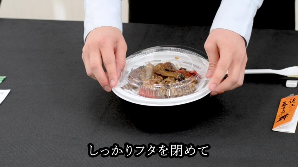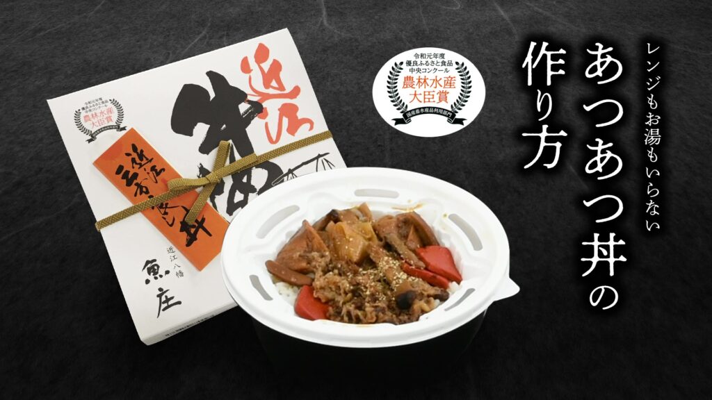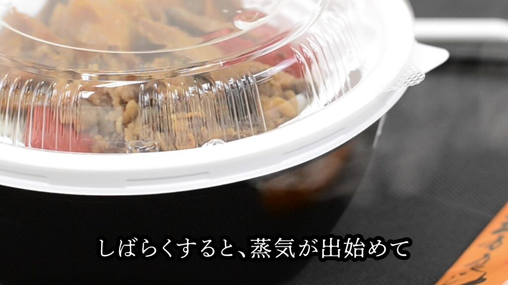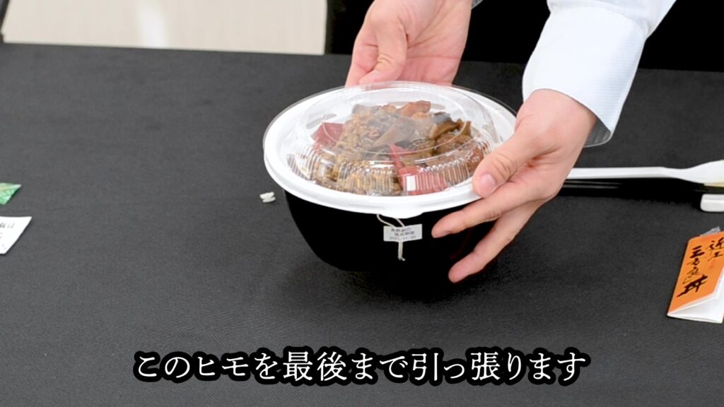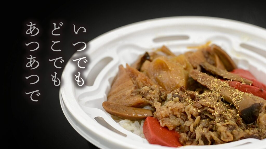 このレトルト丼シリーズは紐を引っ張り少しお待ちいただくと温まり、いつでもどこでもあつあつで食べられます。温かいご飯は大事ですよね。